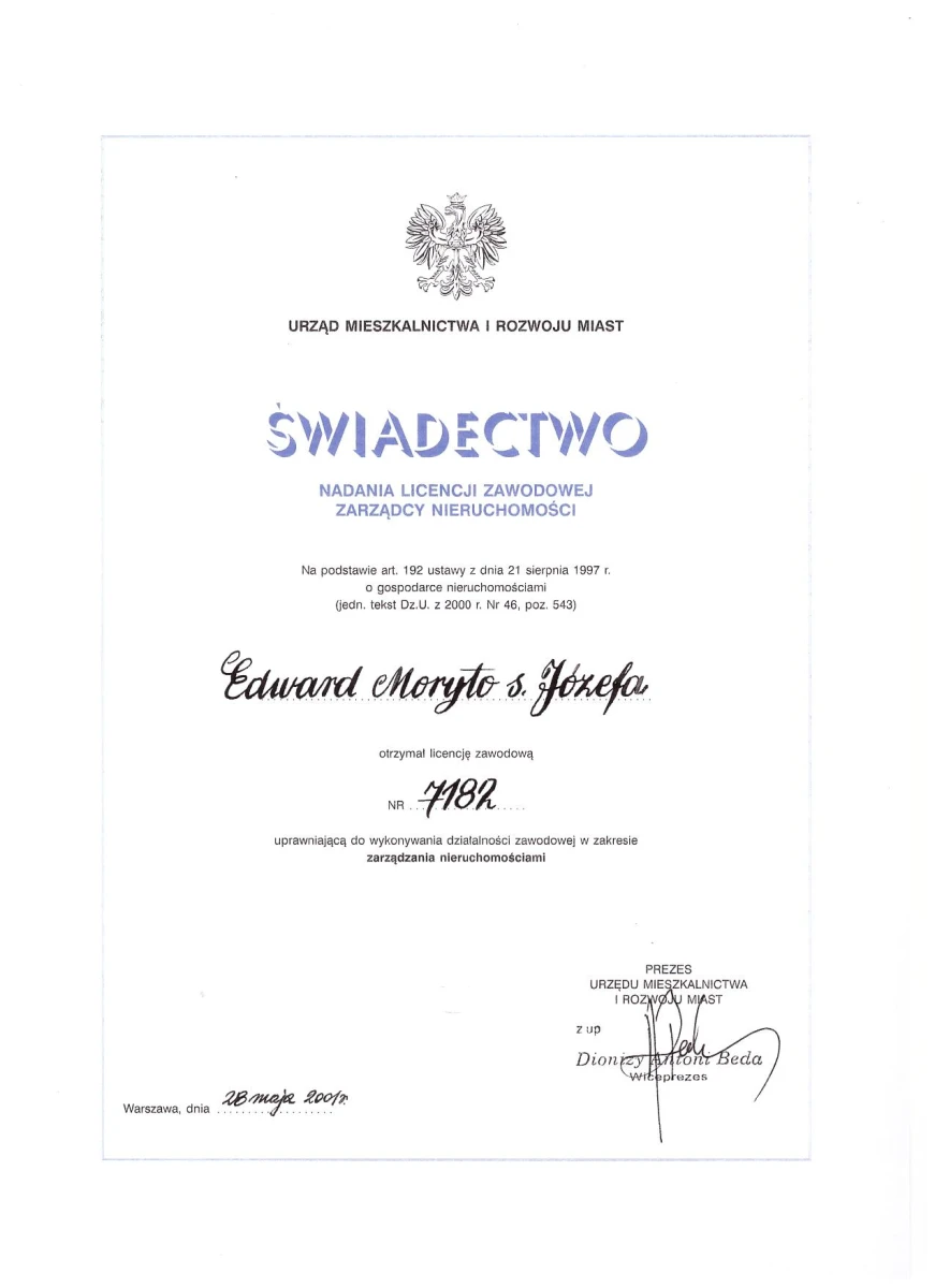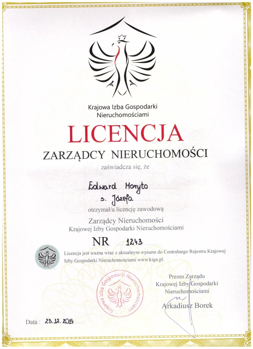Moje doświadczenie w zakresie zarządzania nieruchomościami zdobywane od roku 1993 zostało udokumentowane i złożone przed Komisją Kwalifikacyjną. W dniu 28 maja 2001r. otrzymałem od Urzędu Mieszkalnictwa i Rozwoju Miast licencję zawodową zarządcy nieruchomości nr 7182, której posiadanie stanowiło wóczas warunek prowadzenia działalności w tej dziedzinie. Obecnie jestem licencjonowanym zarządcą nieruchomosci Krajowej Izby Gospodarki Nieruchomościami nr 1243.