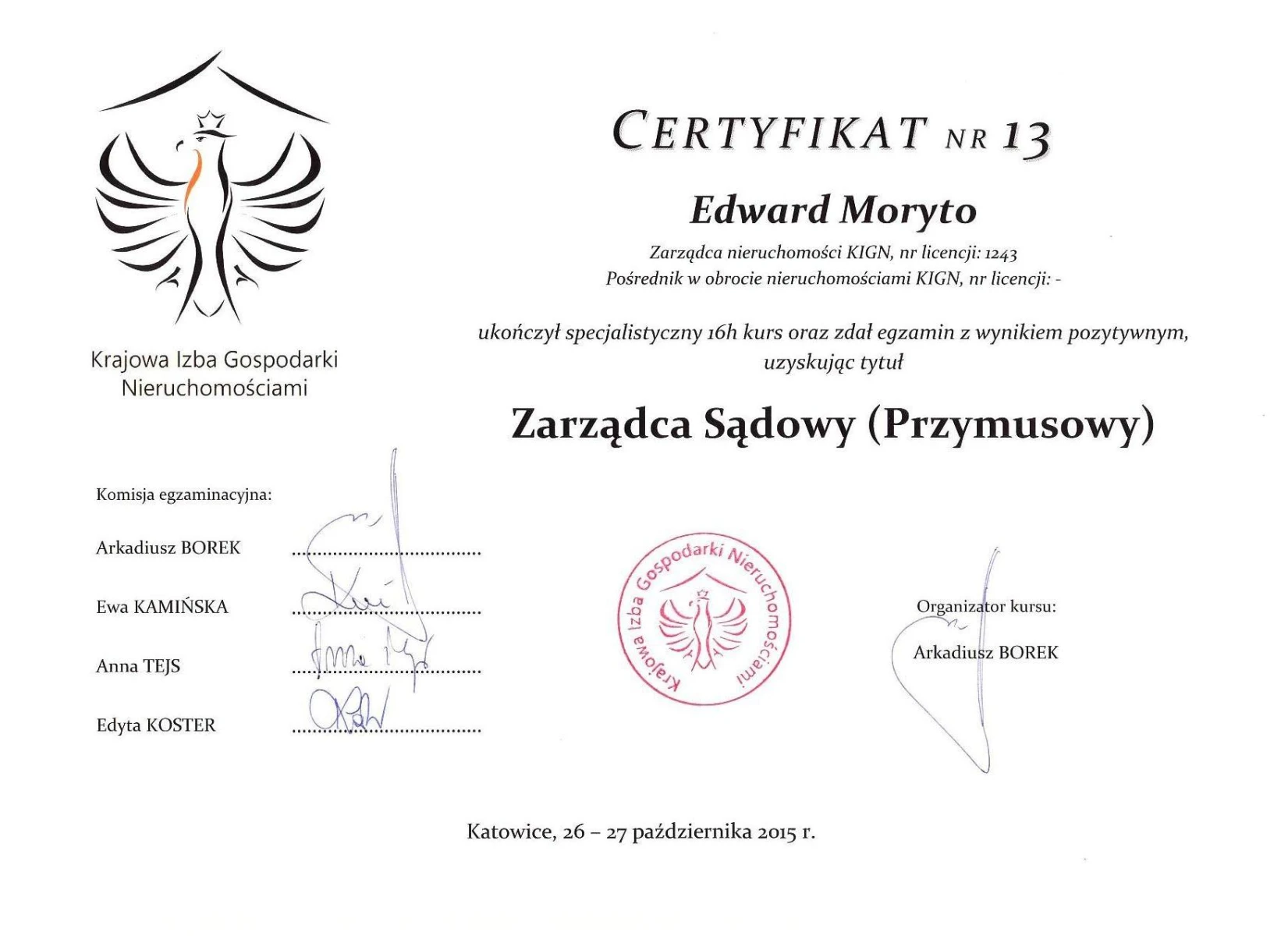 W związku z wysokim zaufaniem jakim cieszymy się wśród właścicieli nieruchomości pomimo wysokiej konkurencji wśród zarządców, postanowilłem rozszerzyć naszą działalność na szeroko rozumianym rynku nieruchomości, dlatego też po pozytywnie zdanym egzaminie w dniu 27.10.2015 otrzymałem certyfikat Zarządcy Sądowego (Przymusowego) nr 13 wydany przez Krajową Izbę Gospodarki Nieruchomościami.